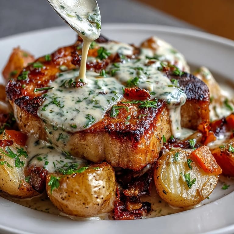 - Taste the gravy and add salt and pepper as needed. Spoon the creamy ranch sauce over the pork chops and vegetables, then garnish with fresh parsley or chives if you want a pop of color.