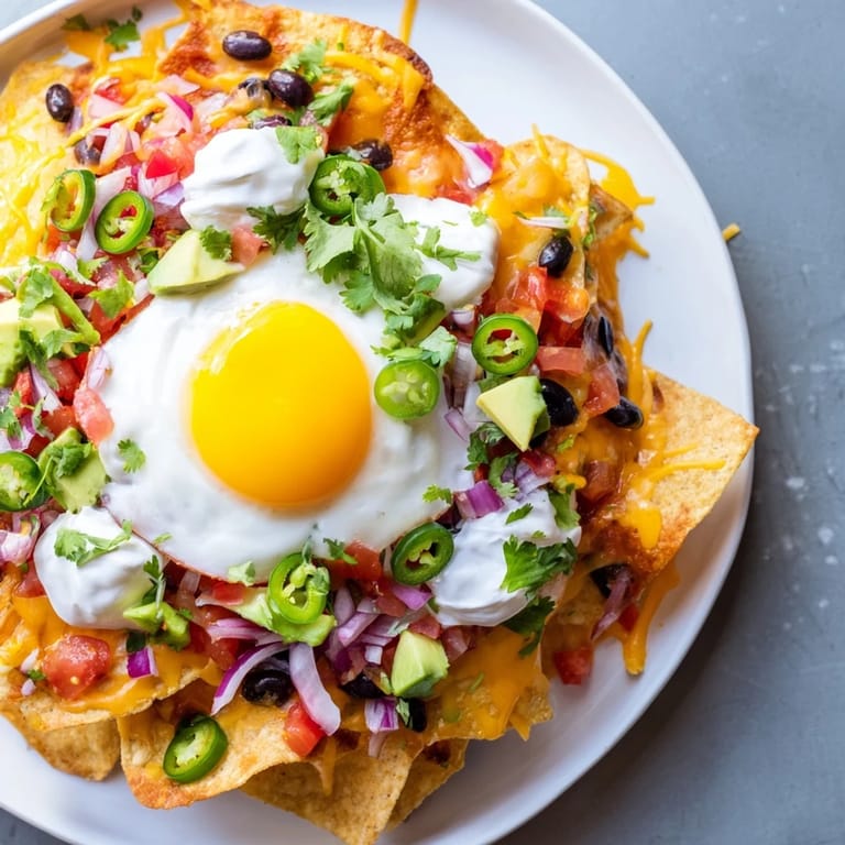 Most breakfast dishes feel like they belong to one category or another—sweet or savory, light or hearty. These nachos exist in this perfect liminal space where they're satisfying enough for brunch yet feel celebratory, like you're doing something a little reckless by adding cheese and eggs to what's technically a snack. The yolk becomes your sauce, the chips give you that necessary crunch, and the vegetables keep everything from tasting like pure indulgence. It's the kind of dish that makes morning feel less like an obligation and more like an occasion.