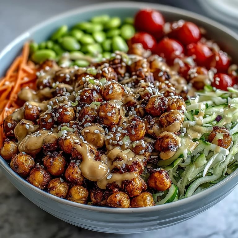 Save There's something about the moment when roasted chickpeas hit a hot pan and start crackling that made me fall in love with this bowl. I was rushing through lunch prep one Tuesday, tossing together whatever vegetables I had, when I realized I could turn a simple pile of ingredients into something that actually felt like a celebration on a plate. The creamy peanut sauce was the turning point—suddenly everything tasted intentional, connected, alive.